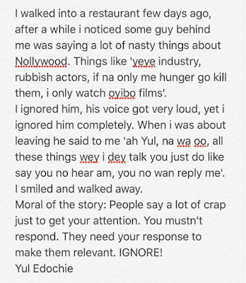 Actor, Yul Edochie took to Instagram to narrate how a man had to resort to insulting Nollywood just to get his attention at a restaurant. Read what he wrote below: