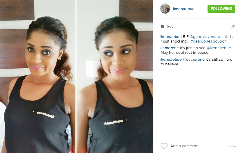 Nollywood Director and Screenwriter, Ike Nnaebue took to his Instagram page this morning to announce the passing of upcoming actress, Genevieve Nene pictured above. She died yesterday May 3rd in Lagos.