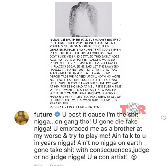 The war between American rapper, Future and his former boss, Rocko just got messier as Future in a deleted Instagram post called him a con artist, fake n*gga and said he will die. Rocko who signed Future to his record label, A1 label in 2011 is suing him for neglecting him after he helped him secure a deal with Epic and also projected his career.