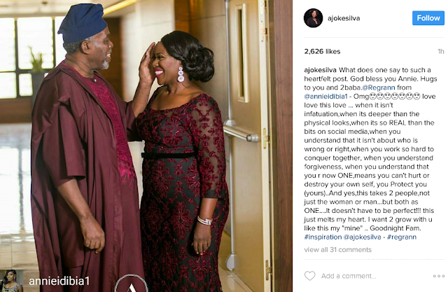 Annie Idibia took to her page to gush about the love Joke Silva and Olu Jacobs, who have been married for almost 32 years share. Joke Silva saw Annie’s post and responded to it. Read the posts after the cut…