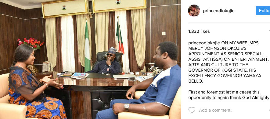Actress Mercy Johnson was earlier this week appointed as the Senior Special Assistant (SSA) to the Kogi State Governor Yahaya Bello, on Entertainment, Arts and Culture. Her husband, Prince Okojie took to IG to give her his full support and to congratulate her on the new appointment. He wrote: