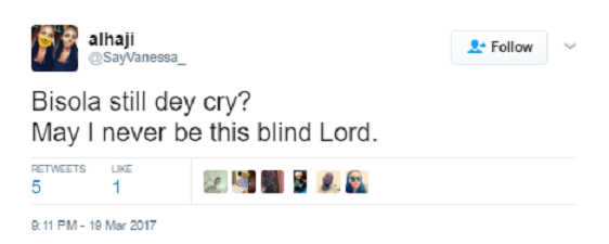 ‘Will you keep kwayet!’ – Twitter users advice Bisola to stop shedding tears over Tony’s eviction