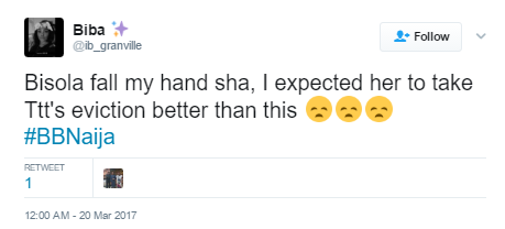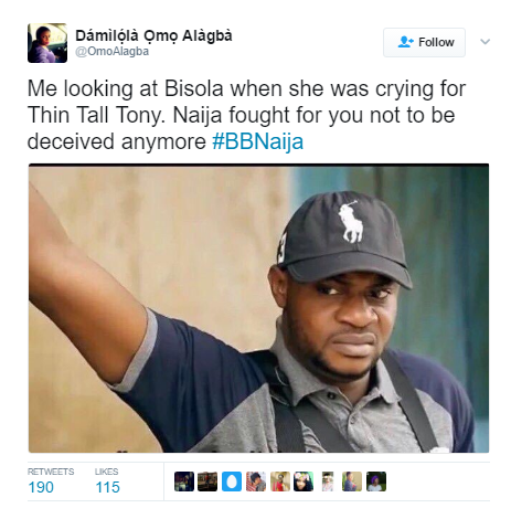 Big Brother Naija Contestant, Bisola had an emotional breakdown as she watched Thin Tall Tony get evicted from the show on Sunday night, She was inconsolable, especially as she watched him walk out of the doors, and indirectly, her life. Although she’s emotionally invested in Tony, she doesn’t know she was a pawn in his game. Twitter users blasted her display of emotion. See more tweets after the cut…