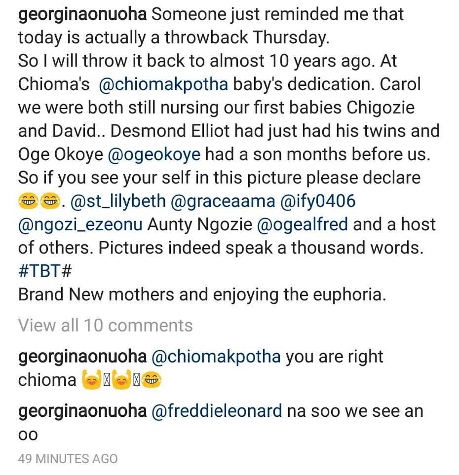 “Someone just reminded me that today is actually a throwback Thursday. So I will throw it back to almost 10 years ago. At Chioma’s @chiomakpotha baby’s dedication. Carol we were both still nursing our first babies Chigozie and David.. Desmond Elliot had just had his twins and Oge Okoye @ogeokoye had a son months before us. So if you see your self in this picture please declare. @st_lilybeth @graceaama @ify0406 @officialngoziezeonu Aunty Ngozie you’ve always been a mother hen to all of us from day one. Tremendous love and respect for Nnem. @ogealfred and a host of others. Pictures indeed speak a thousand words. #TBT# Brand New mothers and enjoying the euphoria.”