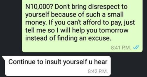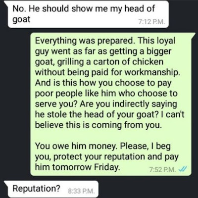 Shirley has refused to pay her balance of N10,000 because of the goat head, something that is not up to N2,000 even in the market. Lolz! See their exchange…