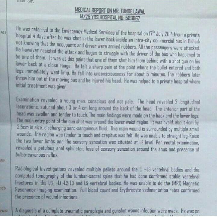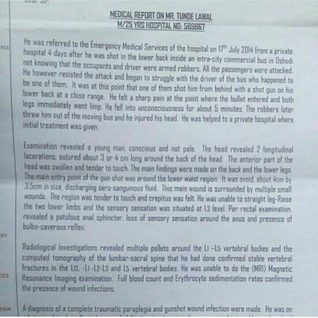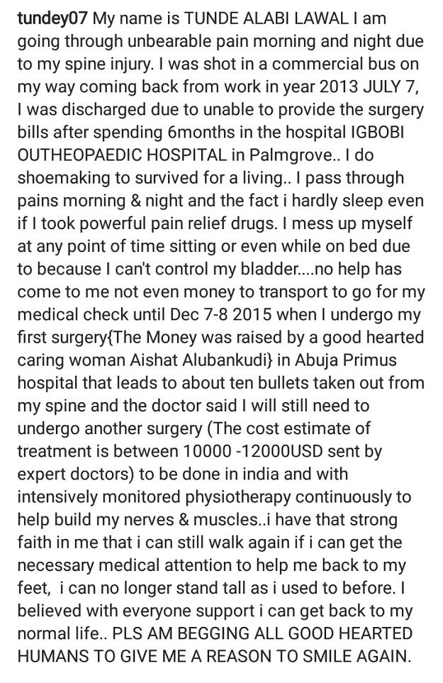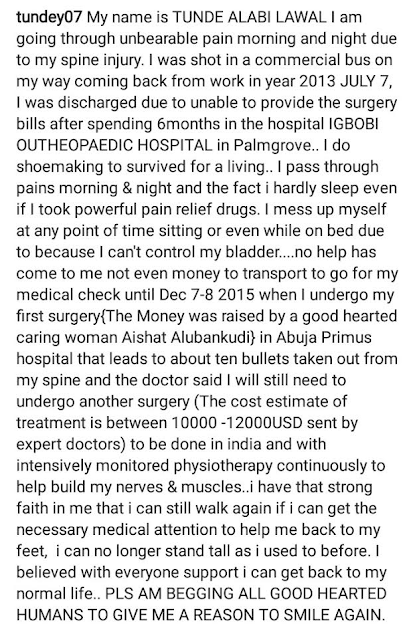 According to his profile, Mr Tunde Lawal lost the ability to control his bladder due to heavy pain relief drugs he took after he was shot in a commercial bus. He revealed that he has done a first successful surgery to remove some bullets from his spine but still needs to get treated in India for more treatments.