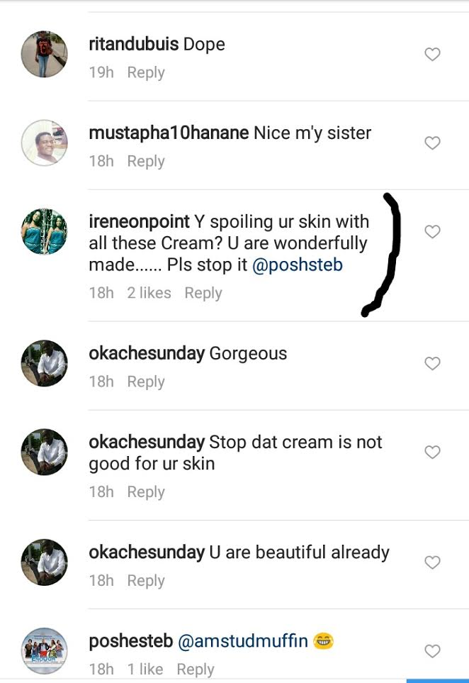 Actress Ebube Nwagbo shared the above picture on her Instagram page and non fans called her out for bleaching and re-rocking her outfit. Ebube took her time to slam one of them. See their comments after the cut…