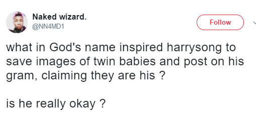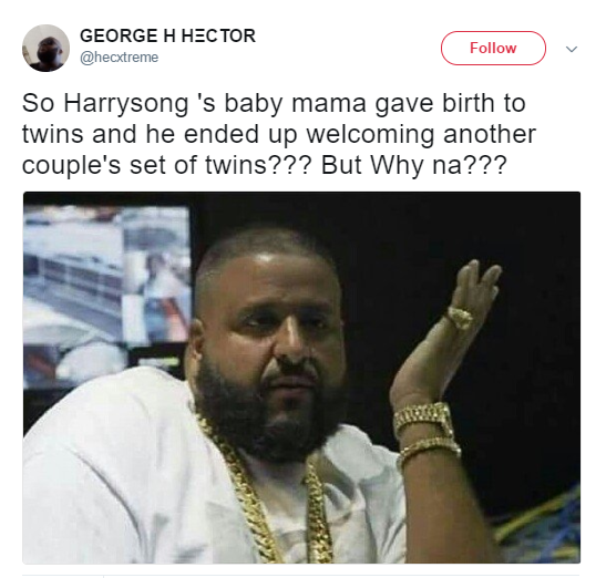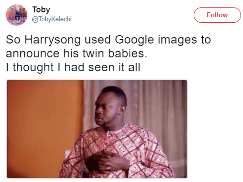 Yesterday, evidence popped up online that Harrysong may have used ‘stolen’ photos to announce the birth of his twins. It’s almost 24-hours after and the singer is yet to deny, defend or even react to the allegations. Some Nigerians aren’t waiting for this explanations though, they are roasting him on twitter already. See more after the cut…
